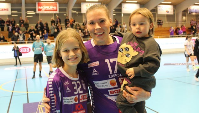 Skara HF tar revansch på VästeråsIrsta HF i en riktigt bra handbollsmatch. Onsdagens möte i Idrottshallen vanns av Skara med 31-25 (14-14). På bilden matchens lirare och sjumålsskytten Sara Johansson tillsammans med prisutdelaren Tove-Lee och dottern Sally. -Väldigt skön seger och det här var utan tvekan en av våra bättre insatser på länge, summerade en glad HF-tränare Magnus Frisk efter slutsignalen. Segt i starten Annars började det här som så måna gånger den senaste tiden. VästeråsIrsta ledde med såväl 3-0 som 4-1 i inledningen. Dessutom drog hemmalaget på sig två utvisningar de första tio minuterna. Skillnaden den här gången var dock de lila tjejerna kom igen och efter 21 minuter var vändningen ett faktum och hemmaledning för första gången (12-11). I slutskedet förvandlades dock en tvåmålsledning till oavgjort 14-14. Sex mål till slut Inledningen av den andra halvlek blev inte heller lyckad och gästerna var i ledning med ett par mål innan den definitiva vändningen kom. Efter en kvart var det tre mål upp för Skara och sedan ökades den bara på för att till slut bli hela sex mål. -Det var starkt att vi kunde komma igen på det här sättet. Tjejerna ska ha stor eloge för insatsen, berömde tränare Frisk. Förstärkning på bänken För första gången hade Magnus sällskap av Kasper Grunditz som assisterande tränare. -Det var verkligen kul att vara med i hetluften igen. Ska bli riktigt roligt att få hjälpa till och samspelet med Magnus tycker jag redan fungerar bra, sade en glad Kasper efter spelarnas segerdans. Många plustecken Det finns mycket positivt att ta fram i Skaralaget den här gången. Sara Johansson fick pris som bäste hemmaspelare. Början blev annars inte så bra för henne med två utvisningar redan i matchupptakten. -Jag blev så himla sur och lovade mig själv att komma tillbaka, sade Sara som höll med om att hon gjorde sin bästa match på länge. Fina insatser Laerke Sörensen fortsätter också att vara bra i mål och svarade inte minst för en rad viktiga räddningar när matchen definitivt avgjordes. Carolina Grindbacka firade sin 31-årsdag med fyra mål och en stark insats efter en period som varit lite tung. Aldis Heimisdottir imponerade åter stort både bakåt och framåt. Ewelina Ström lyste också och noterades för sex mål. -Det känns så härligt att få sätta bollarna. Det här var nog min bästa match för säsongen, summerade Ewelina. Johanna Sigurdardottir måste också nämnas. Inte minst minns vi hur hon kastade sig och offrade allt för att bli först på en boll. -Det var jättekul att spela idag, tyckte Johanna som sken med hela ansiktet… Målgörare: Skara HF: Sara Johansson 7, Ewelina Ström 6, Aldis Heimisdottir 5, Melanie Felber 5, Carolina Grindbacka 4, Johanna Sigurdadottir 2, Emma Gyltman 1 och Sofia Berndtsson 1. VästeråsIrsta HF: Victoria Ortander 4, Ellen Göthlin 4, Viola Paulsen 4, Love Kumlin 4, Fanny Söderberg 3, Tilde Skoog 2, Jonna Olsson 2, Amanda Sjöstrand Hallman 1 och Carolina Ingesson 1. Matchens lirare: Skara Sara Johansson, VästeråsIrsta Love Kumlin. Utvisningar Skara 4, VästeråsIrsta 3. Straffar Skara 5, VästeråsIrsta 2. Domare: Johan Gedda och Joakim Lindbratt. Publik 312 personer. Text och foto: Bengt Andersson