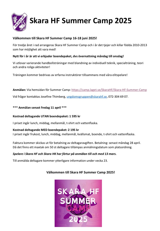 Hej! För info så har anmälan för dom tjejer som vill vara med på Skara HF:s summercamp öppnat! Se info nedan: Hej, Skara HF inbjuder härmed dig som är född 2010-2013 till ”Skara HF Summer Camp” 16-18 juni 2025! Spelare i Skara HF och Skara HK har förtur på anmälan till och med 13 mars. För tredje året i rad arrangeras Skara HF Summer Camp och i år det tjejer och killar födda 2010-2013 som har möjlighet att vara med! Nytt för i år är att vi erbjuder boendepaket, dvs övernattning måndag till onsdag! Vi utlovar varierande handbollsträningar med blandning av individuell teknik, specialträning, fysträning, teori och andra roliga aktiviteter. Träningen kommer bedrivas av erfarna instruktörer tillsammans med våra elitspelare! Anmälan: Via hemsidan för Summer Camp: https://camp.laget.se/SkaraHF/Skara-HF-Summer-Camp Vid frågor kontaktas Josefine Thimberg, ungdomsgruppen@skarahf.se, 072-304 69 07 *** Anmälan senast fredag 11 april *** Kostnad deltagande UTAN boendepaket: 1 595 kr I priset ingår lunch, middag, mellanmål, t-shirt och vattenflaska. Kostnad deltagande MED boendepaket: 2 195 kr I priset ingår frukost, lunch, middag, mellanmål, kvällsmat, boende, t-shirt och //Med vänliga hälsningar arrangörsgruppen och styrelsen i Skara HF
