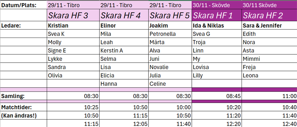 Hej! Åren går fort och det är nu dags för tjejerna i F9 att spela sina sista matcher på minihandbollsplan. Sammandrag omgång 3 spelas i Tibro den 29/11 (Tre lag) och i Skövde den 30/11 (Två lag). Lagindelning samt preliminära matchtider finns i bifogad bild. Vi har också skickat ut kallelser för respektive tillfälle och vi ber er även svara på dessa. Varma Hälsningar, Ledarna i F9