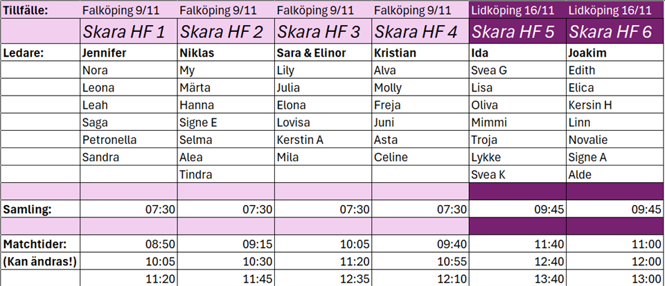 Hej! Här kommer arbetsschema för A-lagsmatchen den 2/11. Information Arbetsschema: Har ni inte möjlighet att på arbeta på utsatt pass ansvarar ni själva för att byta med varandra eller någon annan i laget! Samling kl. 14.00 i foajén för genomgång av arrangemanget. Entré: 3 st vuxna – Freja, Celine, Kerstin A Kiosk (tre i foajén och två i hallen): 5 st Vuxna – Linn, Lisa, Lycke, Leah, Molly Lottförsäljning (50/50-lotteriet): 4 Vuxna – Elona, Novalie, Signe A, Lilly Lila shopen/bollförsäljning: 3st vuxna – Hanna, Alea, Juni Försäljning av bollar till Sparbankskastet pågår fram till halvlek och försäljning av övriga varor pågår ända tills matchen är slut. Efter matchens slut ska varor packas ner och ställas undan på anvisad plats. Efter halvlek, när Sparbankskastet är klart, ska bollarna till nästa hemmamatch göras i ordning. (Detta görs under andra halvlek eller efter matchens slut.) När matchen är slut hjälps alla åt med att grovstäda läktaren, ta bort sopsäckar och ta hand om panten. Information maskot: Samling 15:30 Badhus entrén - medtag inomhusskor - matchställ fås på plats. Ses på söndag! Ledarna i Skara HF F9